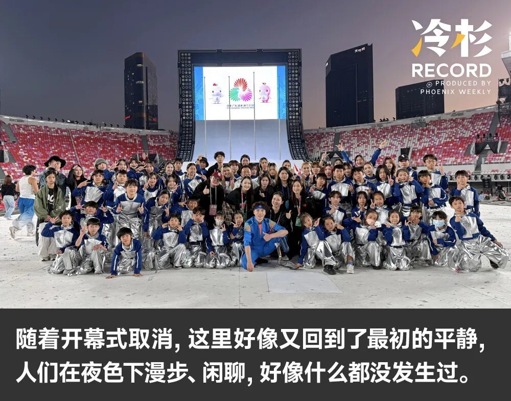 姚欣则告诉我们,她有散步的习惯,经常在晚上经过天河体育场。彩排期间,体育场周边的跑道都被很正式地封住,充斥着紧张筹备的气氛,非演职人员不能靠近。但随着开幕式取消,这里好像又回到了最初的平静,人们在夜色下漫步、闲聊,好像什么都没发生过。